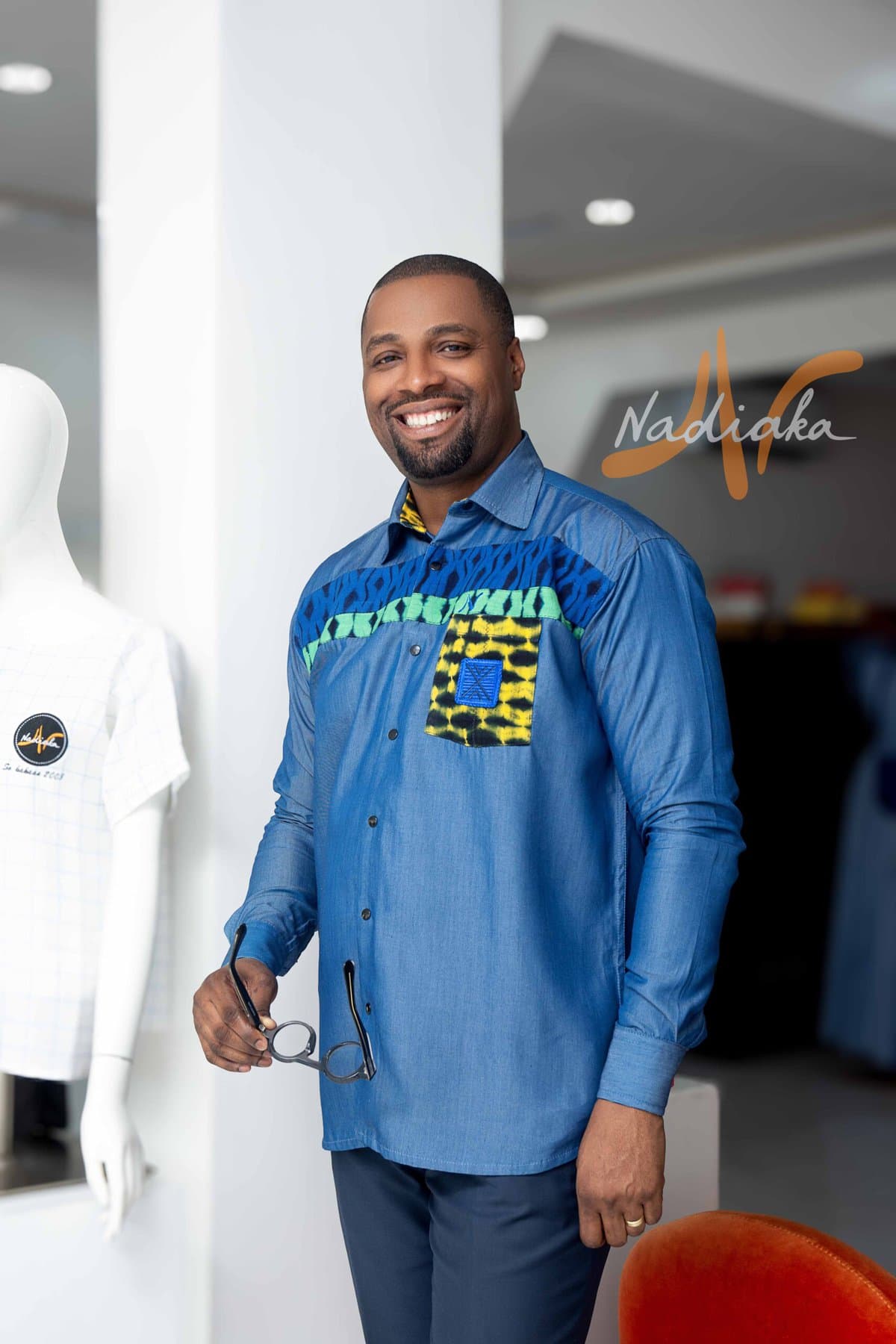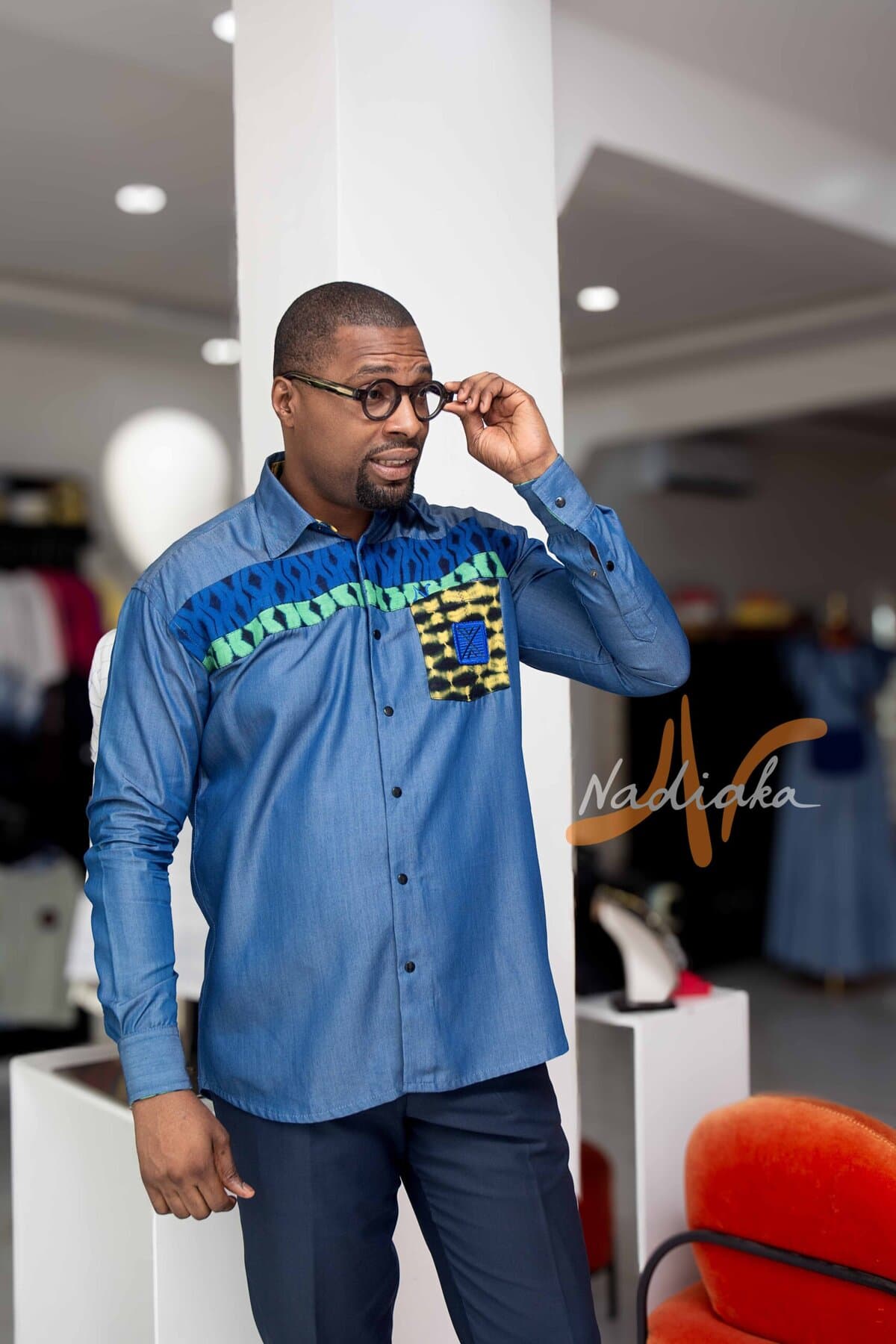 Chemise manches longues en tissu jean mix pagne baoulé , col classique