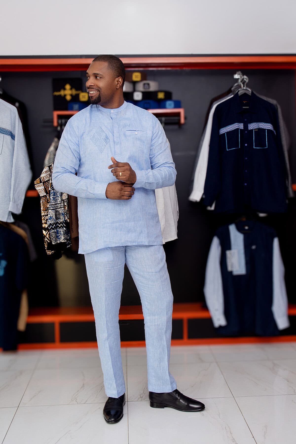 Ensemble tunique manches longues et pantalon en lin de couleur bleue