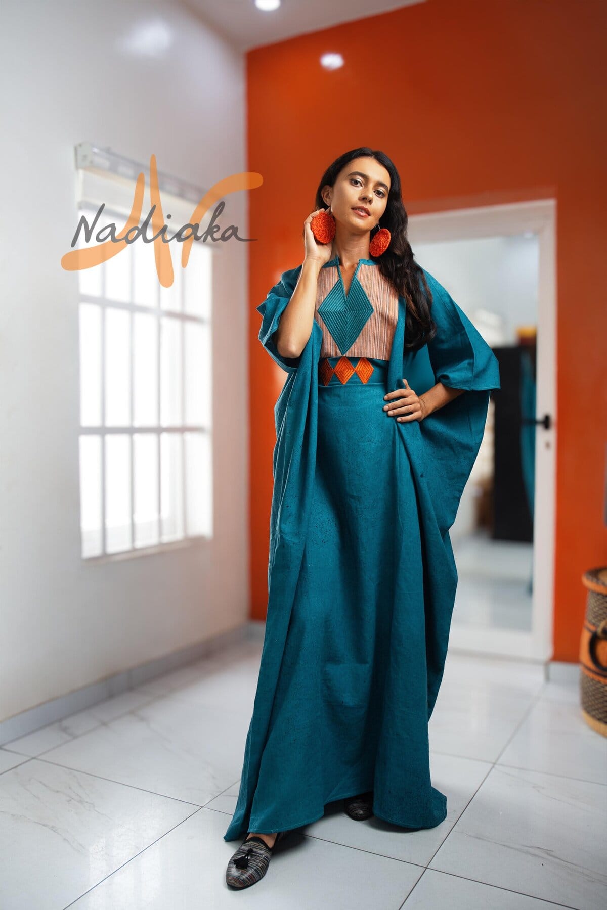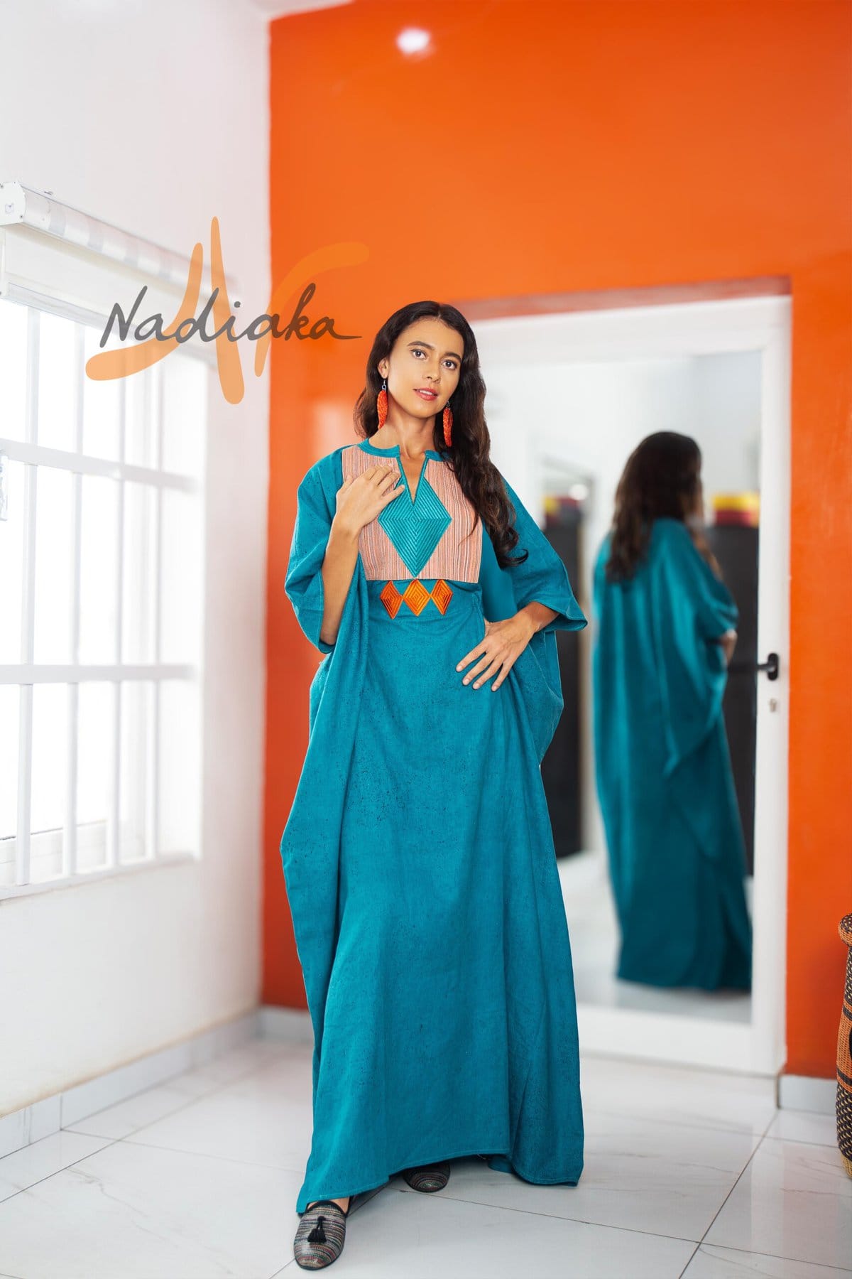 Long boubou brodé teinture à jet de couleur vert turquois. One size